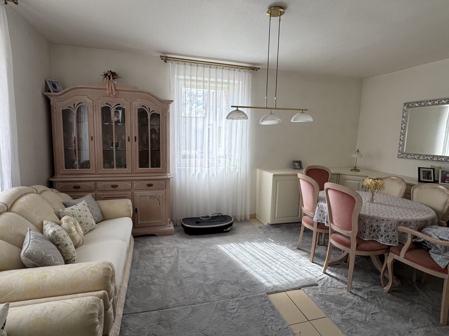 Im Erdgeschoss befinden sich die geräumige Küche, ein Duschbad sowie eine einladende Diele mit Treppenaufgang ins Obergeschoss. Zudem wurde aus ursprünglich zwei Räumen ein großzügiges Wohnzimmer geschaffen, das direkten Zugang zur Terrasse bietet und viel Platz für gemeinsames Wohnen und Entspannen bereithält. Die vorhandene Einbauküche kann bei Interesse gegen Abstand übernommen werden.
