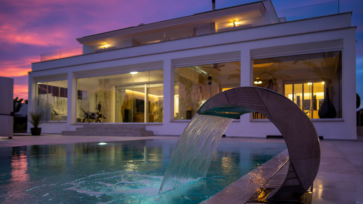 Die Villa ist vollunterkellert mit 170m² und verfügt über eine Tiefgarage für 2-3 Fahrzeuge, diverse Abstellräume inklusive klimatisierten Waschraum, Fitnessbereich und Pooltechnik . Im Erdgeschoss befinden sich 2 Schlafzimmer, 1 Bad, ein Gäste-WC, ein Wohn-/Essraum mit offener großer Küche und Abstellräumen. Zudem gibt es eine verglaste überdachte Terrasse mit Schiebefenstern, Kamin und Zugang zum Garten/Pool mit BBQ Bereich und Außenküche.