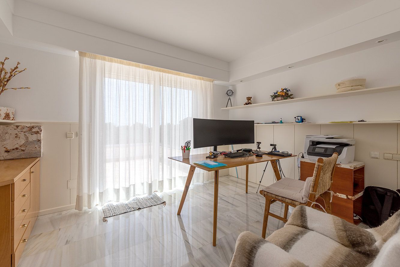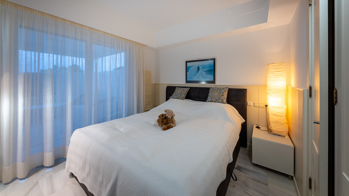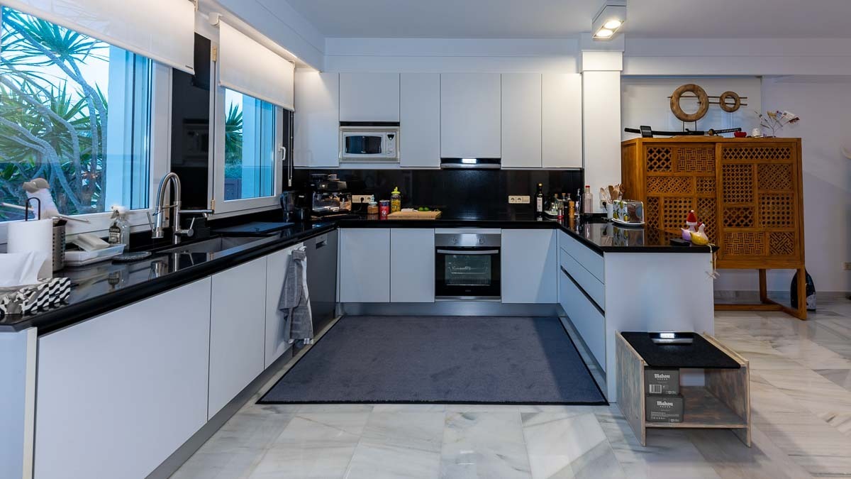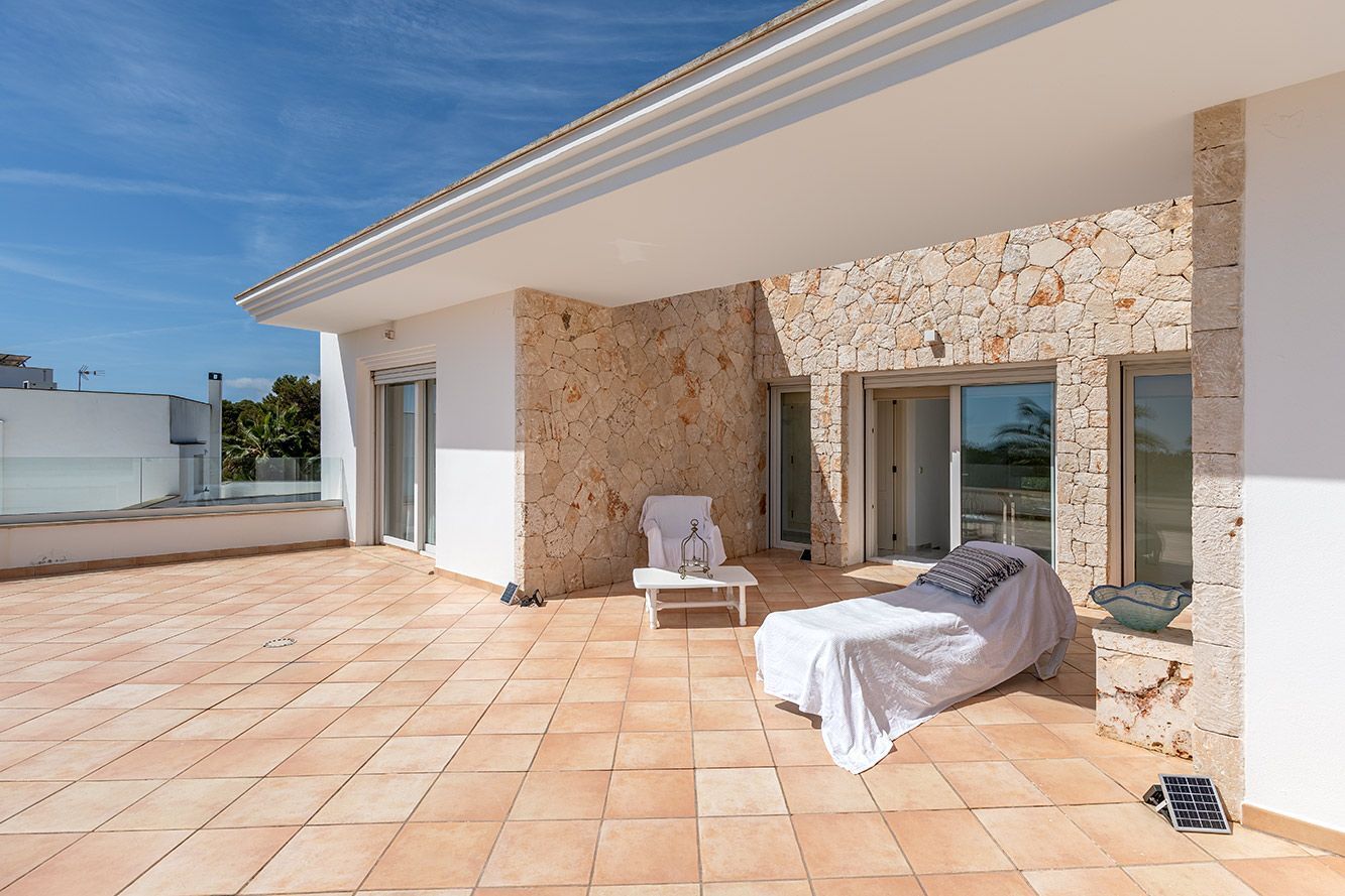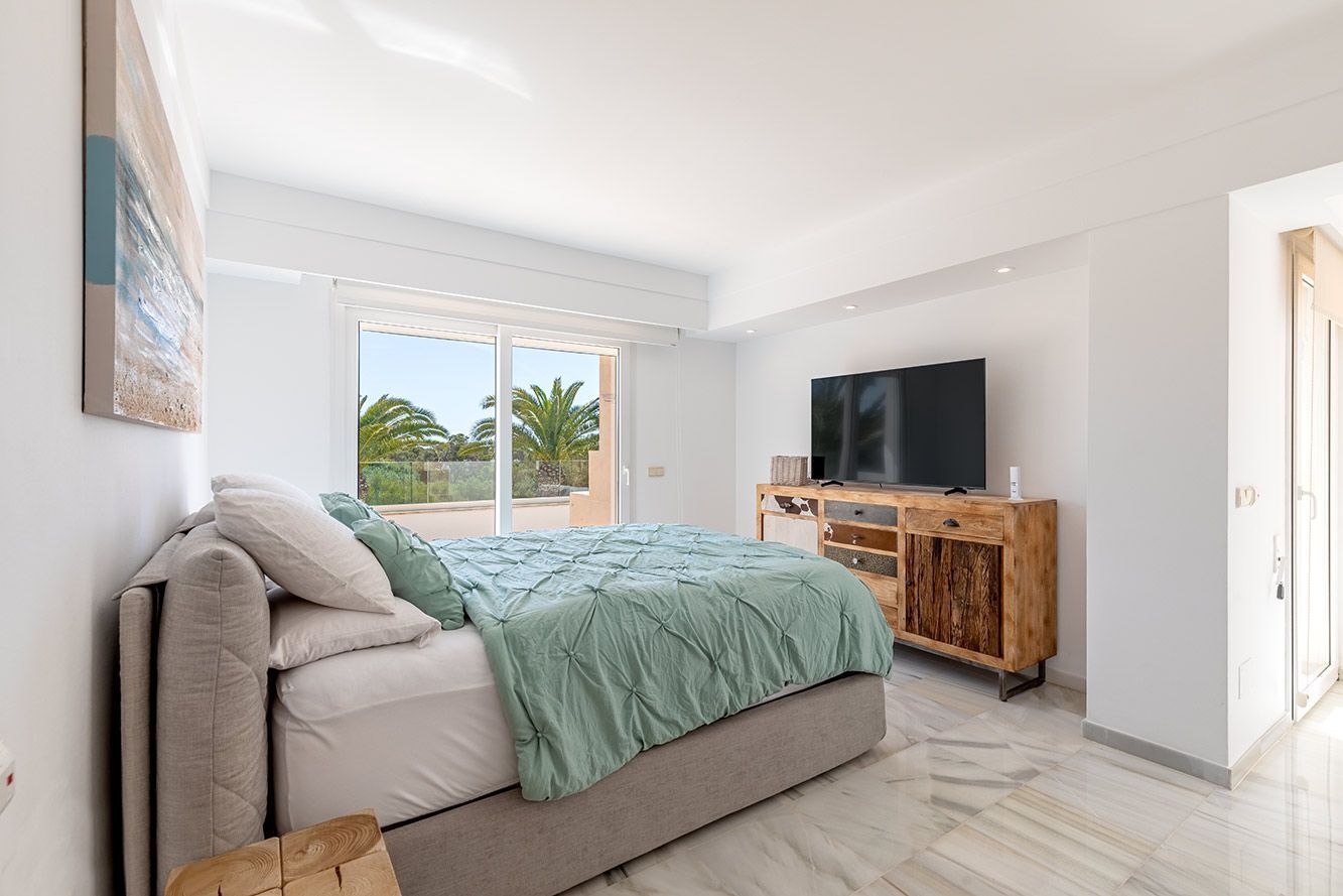 Das 938 qm große Grundstück beherbergt einen sehr gepflegten Garten mit automatischer Bewässerung sowie einen großzügigen 33 qm Pool. Auf der Terrassenfläche von insgesamt 160 m² (80 m² offen, 80 m² überdacht) kann man den Meerblick genießen. Im Obergeschoss befinden sich 2 weitere Schlafzimmer mit Bädern en Suite und eine große Terrasse mit Meerblick.