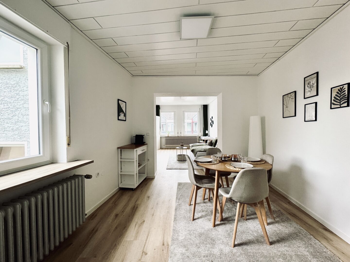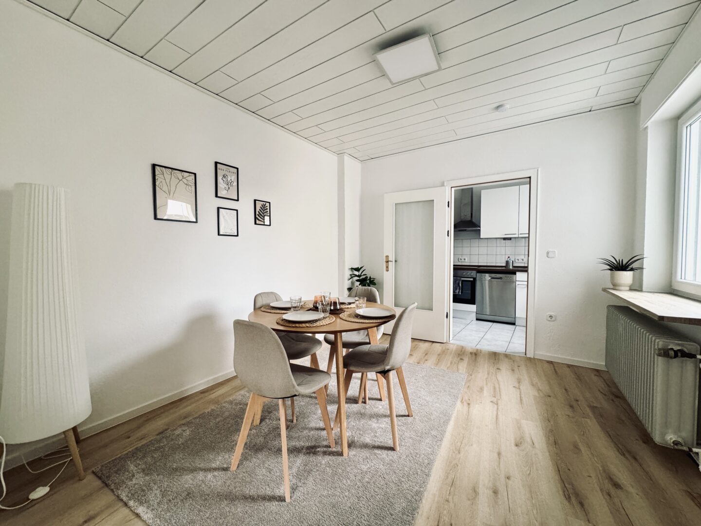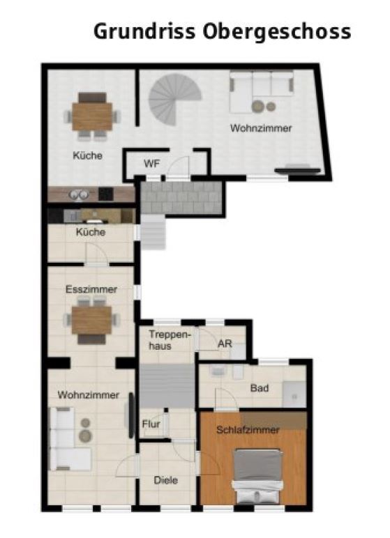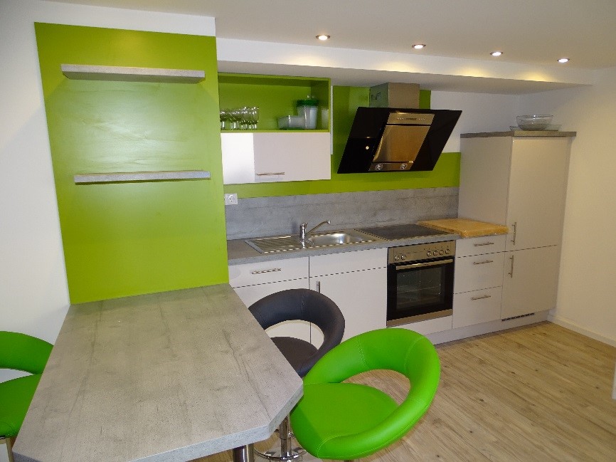 Das 1. Obergeschoss (Altbau) umfasst ebenfalls ca. 60 m² mit 2,5 Zimmern, Küche, Bad und Stauraum. Auch hier ist die Küche bereits möbliert.