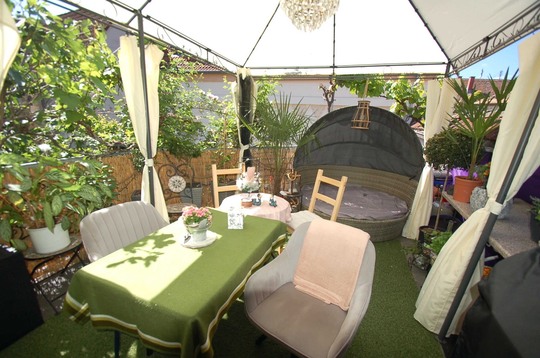 - ein gemütlicher Wintergarten mit angrenzender überdachter Terrasse.