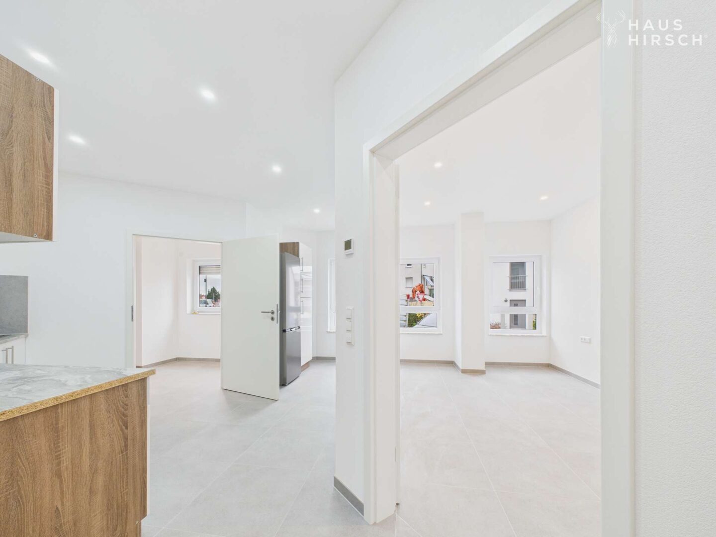 Willkommen zu dieser besonderen Besichtigung! Hier erwartet Sie ein einzigartiges Wohnkonzept mit zwei kernsanierten 4-Zimmerwohnungen. Beginnen wir mit der behindertengerechten Erdgeschosswohnung. Betreten Sie die Wohnung durch den eigenen Eingang und lassen Sie sich von den hochwertigen Details begeistern. Die neuen Kunststofffenster sorgen für angenehmes Licht und die elektrischen Rollläden bieten Ihnen Komfort auf Knopfdruck. Die grauen Steinzeugfliesen in 60x60 ziehen sich durch die gesamte Wohnung und verleihen ihr eine moderne Note. Die neu ausgestattete Küche lässt keine Wünsche offen und lädt zum Kochen und Genießen ein.