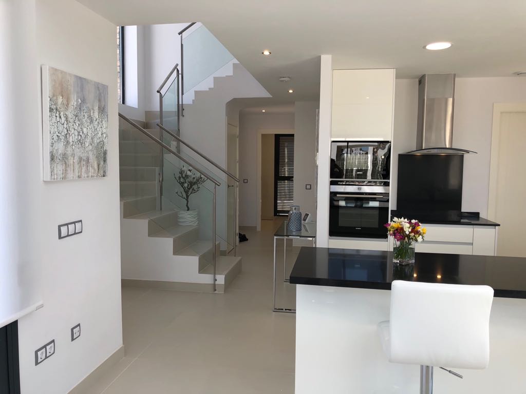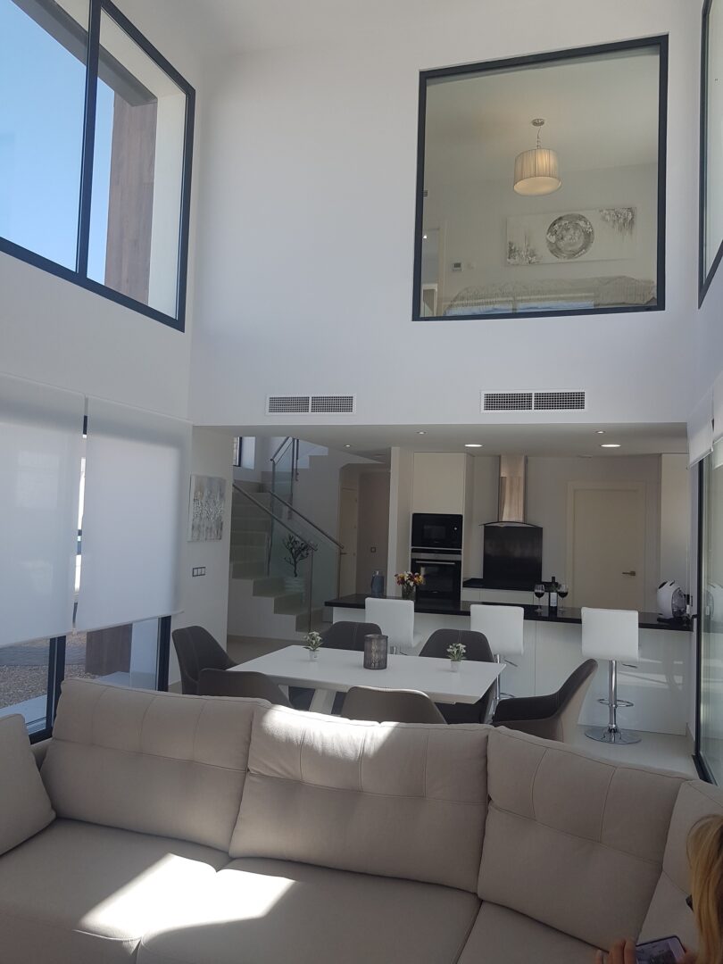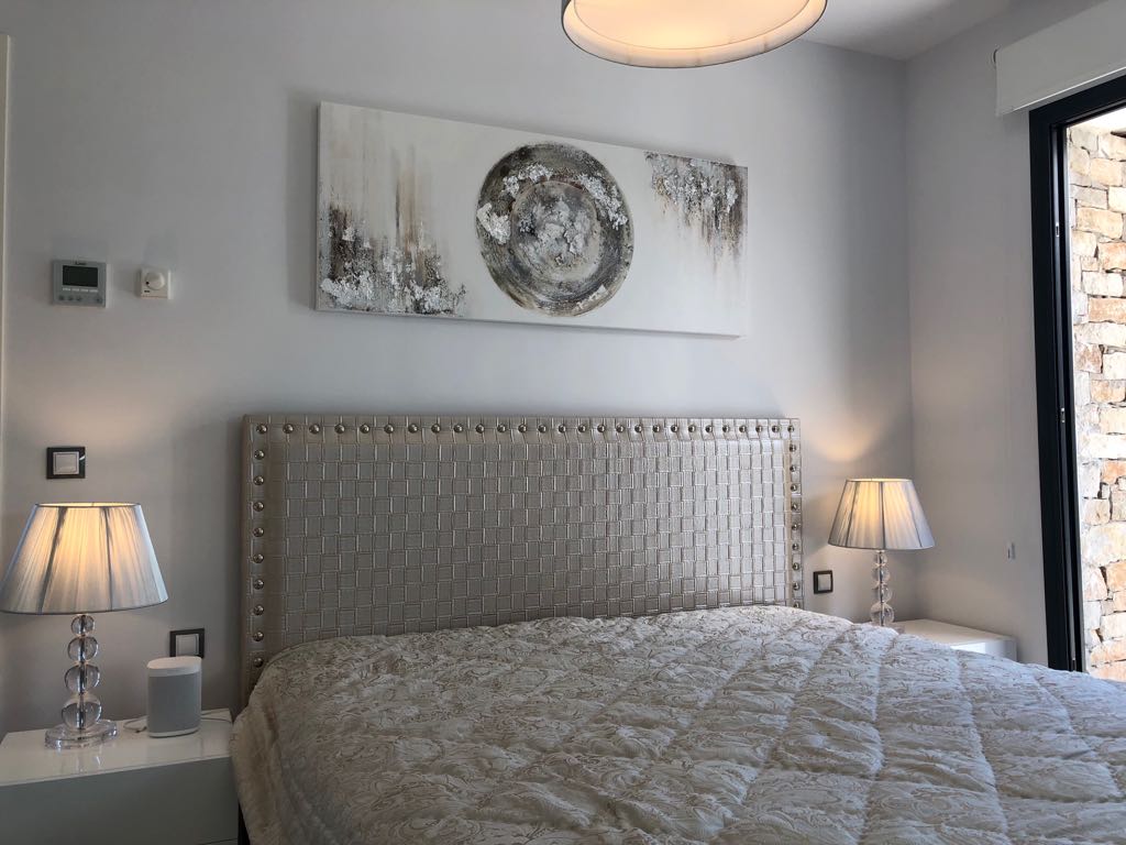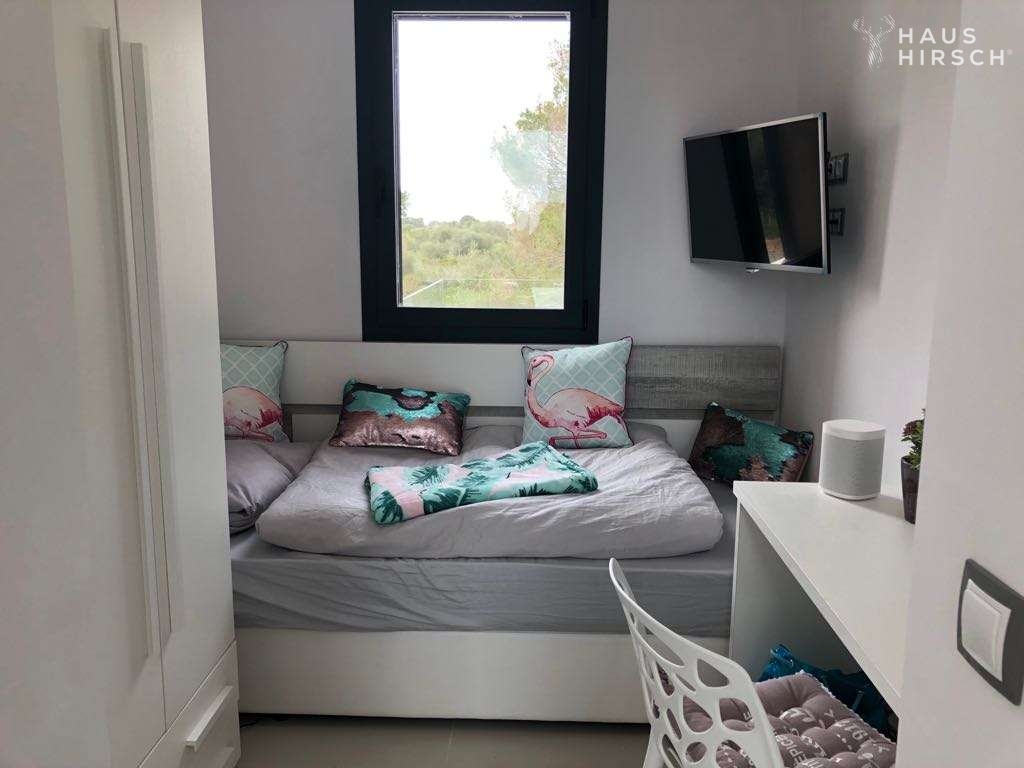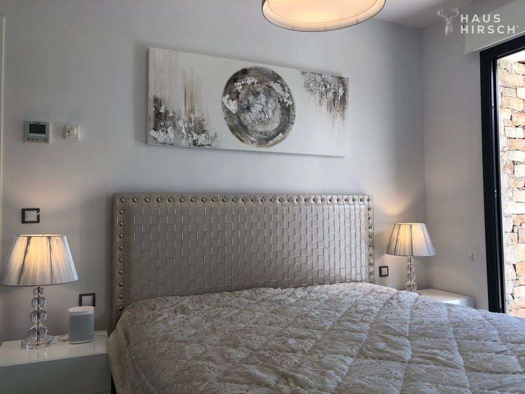 Es stehen zwei große Schlafzimmer mit Einbauschränken zur Verfügung, im Erdgeschoss und das Masterschlafzimmer im Obergeschoss. Ein drittes, etwas kleineres Zimmer im Obergeschoss wird derzeit als Gästezimmer oder Büro genutzt. Der wunderschöne Balkon mit Bergblick lädt zum Entspannen ein, während der zweite Balkon, ideal vom Badezimmer erreichbar, mit einem hochwertigen Hottub der Marke USSPA ausgestattet ist. Große, doppelt verglaste Fenster und die eindrucksvolle Wohnraumempore verleihen dem Haus seine besondere Großzügigkeit und Eleganz.