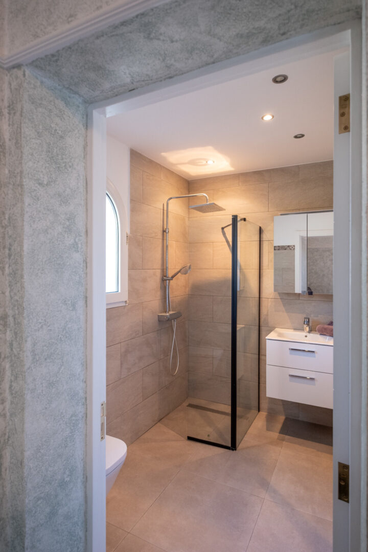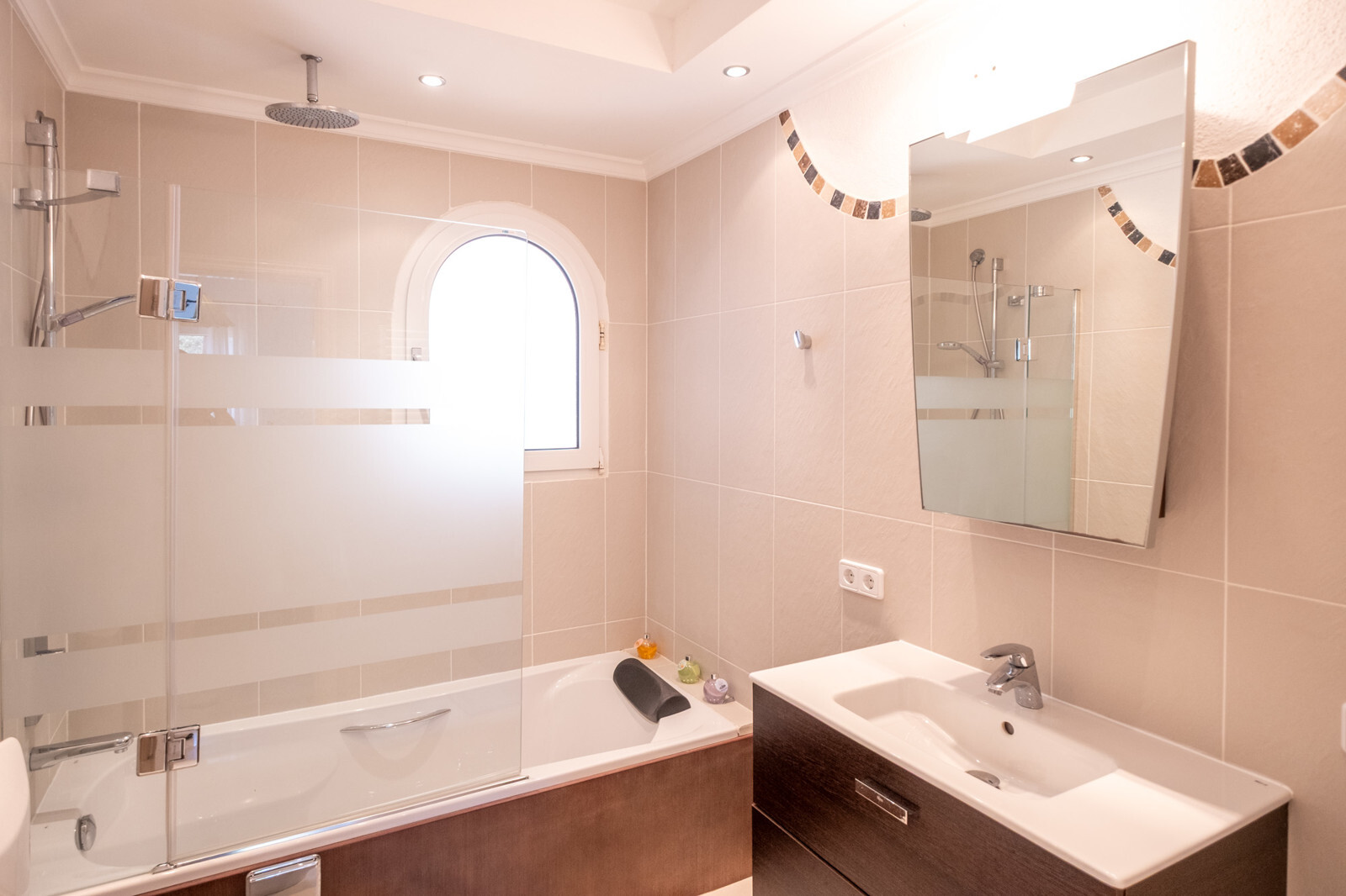 Zwei geräumige Schlafzimmer mit Einbauschränken und modernisierten En-Suite-Bädern – eines davon mit luxuriöser Fußbodenheizung – garantieren höchsten Komfort. Über eine Außentreppe erreichen Gäste ein separates Apartment mit eigenem Wohnbereich, Küche und zwei privaten Balkonen, was maximale Unabhängigkeit ermöglicht. Ob als Büro, oder für Familien oder Freunde, es ist vielseitig nutzbar.