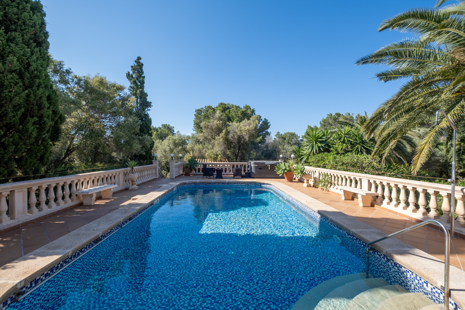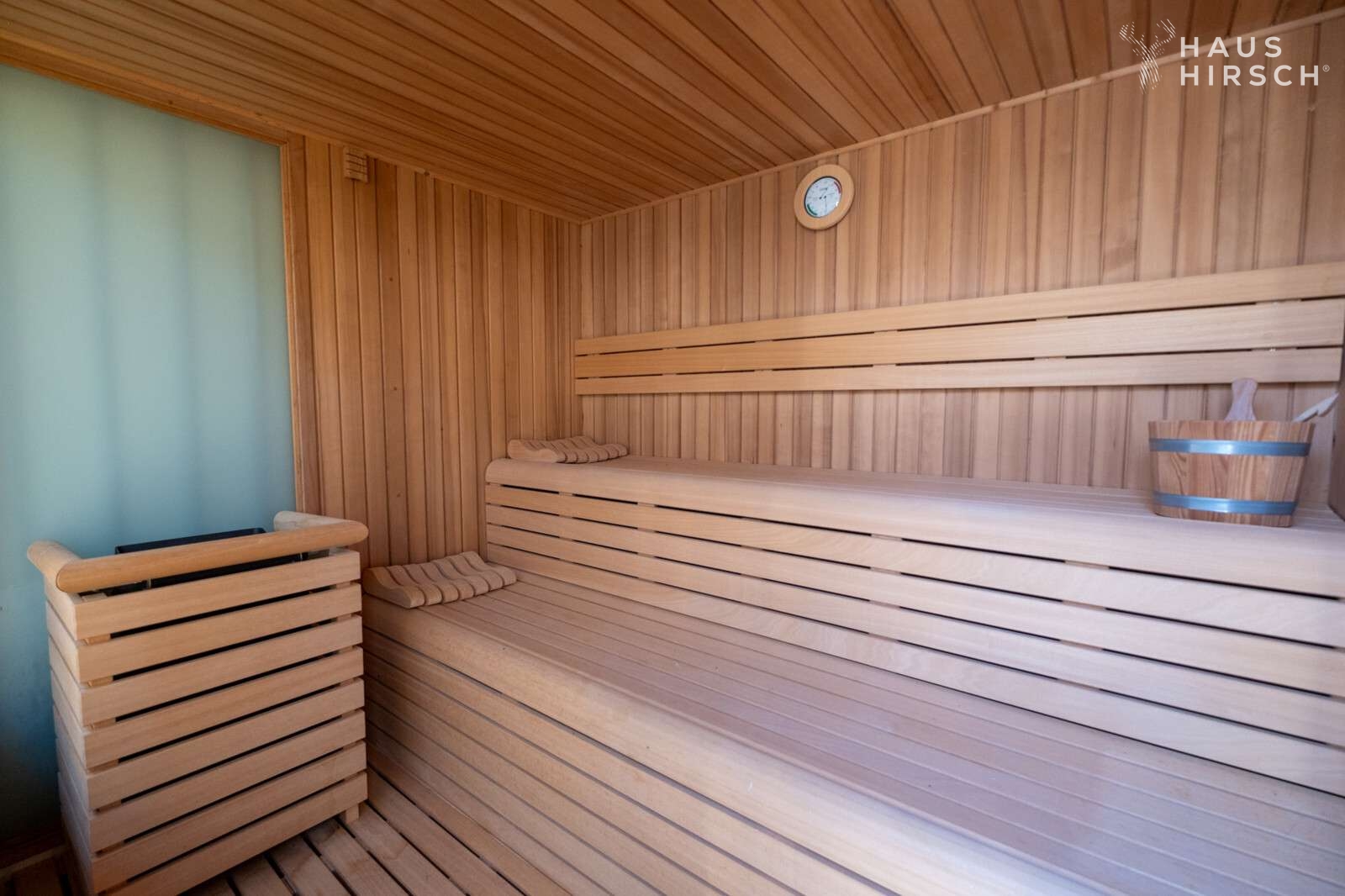 Der Außenbereich ist eine wahre Oase: Entspannen Sie im gepflegten Garten, ziehen Sie Bahnen im Pool mit Gegenstromanlage oder genießen Sie den Whirlpool. Ein besonderes Highlight ist das noch unbenutzte Saunahaus im hinteren Teil des Grundstücks.