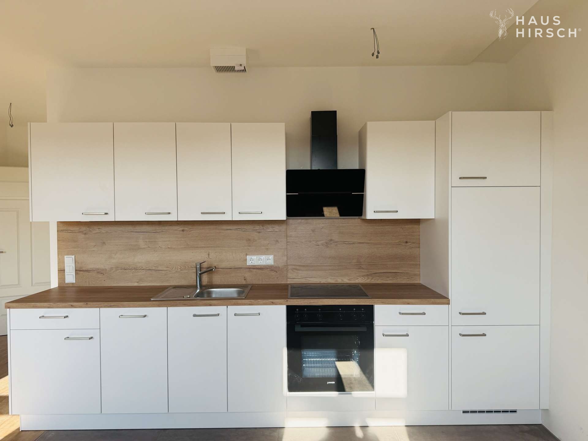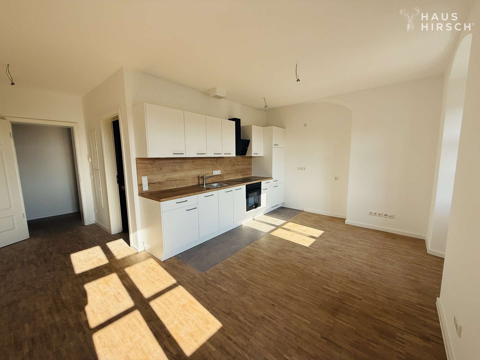 Zurück im Flur führt der Weg zum Herzstück der Wohnung – dem großzügigen Wohnzimmer mit integrierter Einbauküche. Hier vereinen sich Wohn- und Kochbereich zu einem offenen Raum, der zum gemeinsamen Kochen und gemütlichen Beisammensein einlädt.